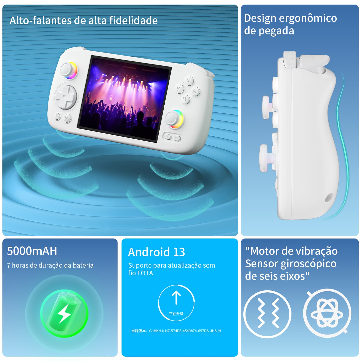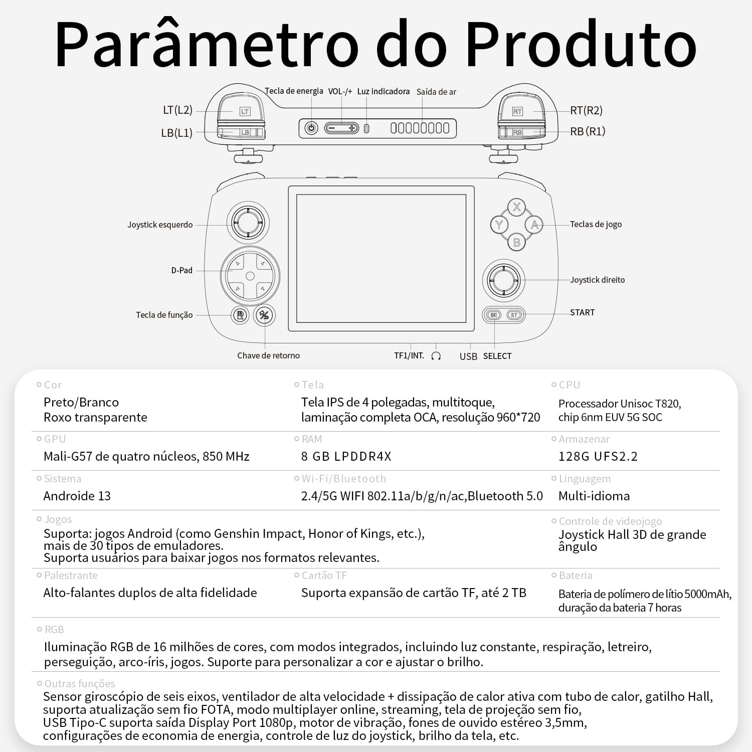 | outra função | Sensor giroscópio de seis eixos, ventilador de alta velocidade + dissipação de calor ativa com tubo de calor, gatilho Hall, suporta atualização sem fio FOTA, modo multiplayer online, streaming, tela de projeção sem fio, USB Tipo-C suporta saída Display Port 1080p, motor de vibração, fones de ouvido estéreo 3,5mm, configurações de economia de energia, controle de luz do joystick, brilho da tela, etc. |