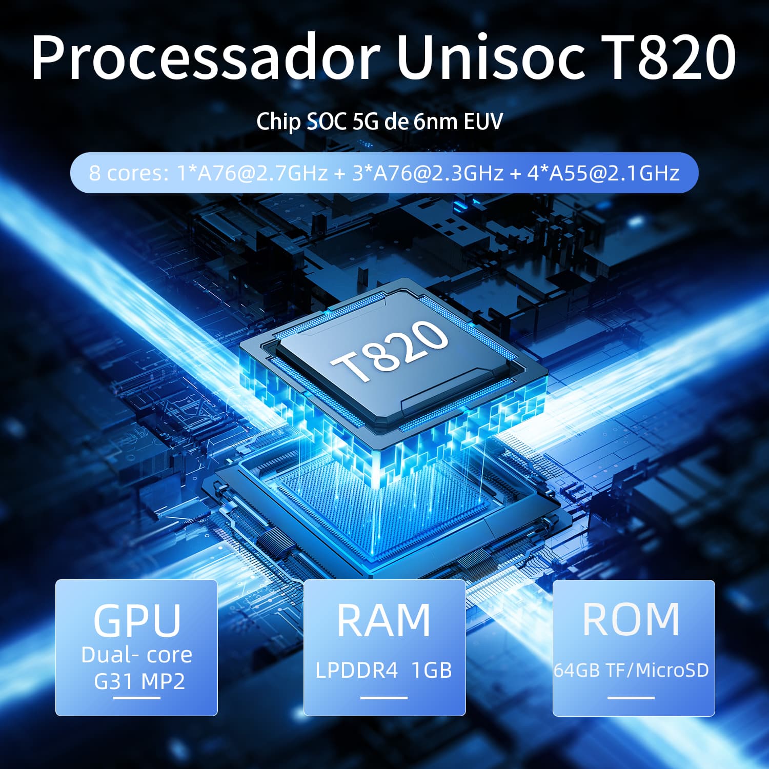 | CPU | Processador Tiger T820, chip SOC 5G EUV de 6nm 8 núcleos: 1A76@2,7GHz + 3A76@2,3GHz + 4*A55@2,1GHz |