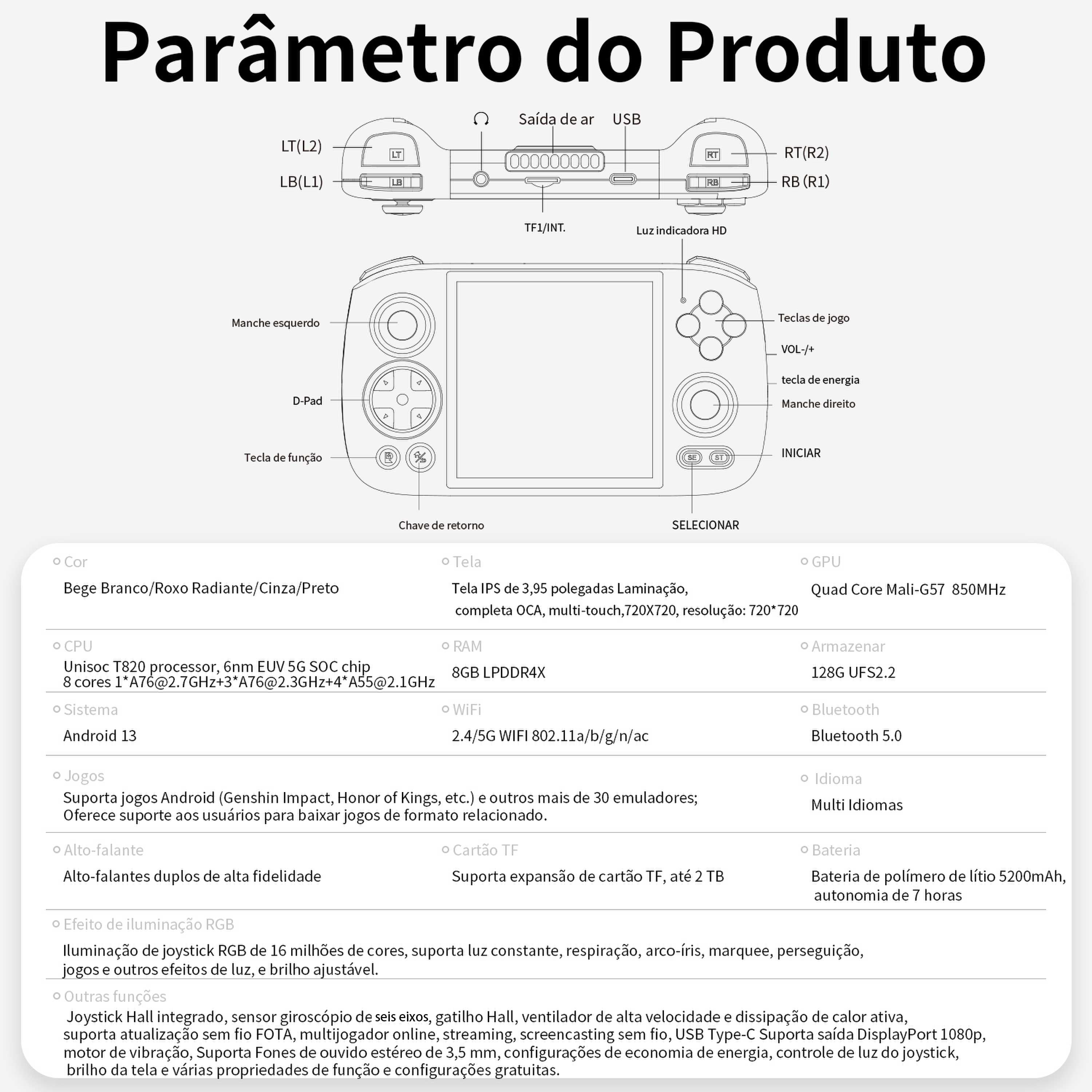 | Outras funções | Joystick Hall integrado, Sensor giroscópio de seis eixos, gatilho Hall, ventilador de alta velocidade e dissipação de calor ativa, suporta atualização sem fio FOTA, multijogador online, streaming, screencasting sem fio, USB Type-C Suporta saída DisplayPort 1080p, motor de vibração, Suporta Fones de ouvido estéreo de 3,5 mm, configurações de economia de energia, controle de luz do joystick, brilho da tela e várias propriedades de função e configurações gratuitas. |