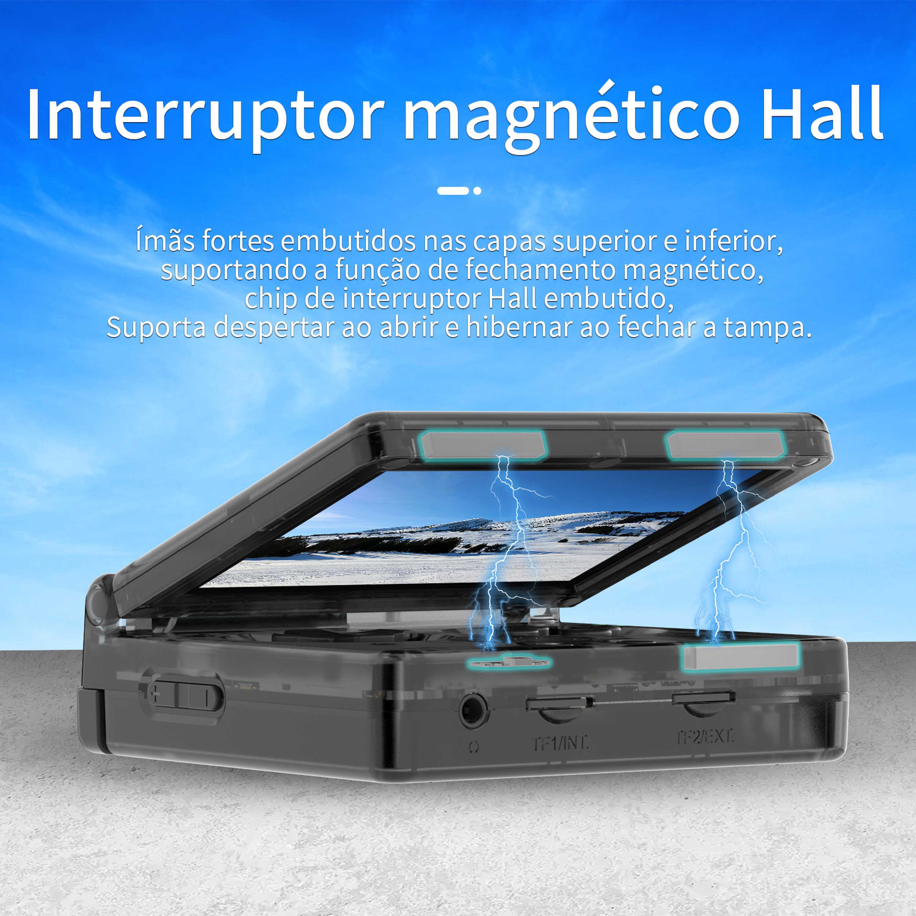 | Interruptor magnético Hall | Ímãs fortes integrados nas tampas superior e inferior, apoiando a função de fechamento magnético; chip de interruptor Hall integrado, Suporta despertar ao abrir e hibernar ao fechar a tampa. |