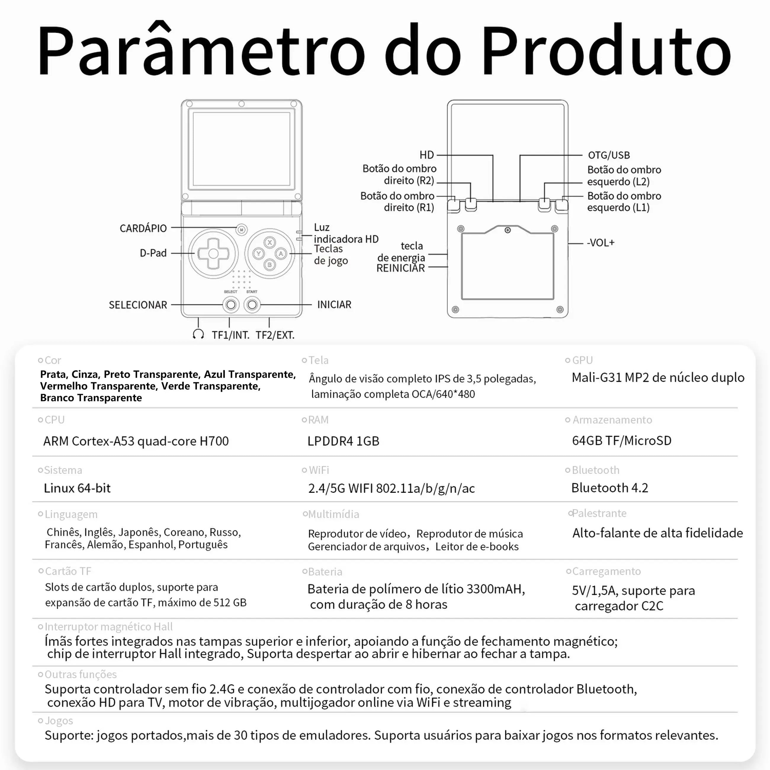 | Outras funções | Suporta controlador sem fio 2.4G e conexão de controlador com fio, conexão de controlador Bluetooth, conexão HD para TV, motor de vibração, multijogador online via WiFi e streaming |