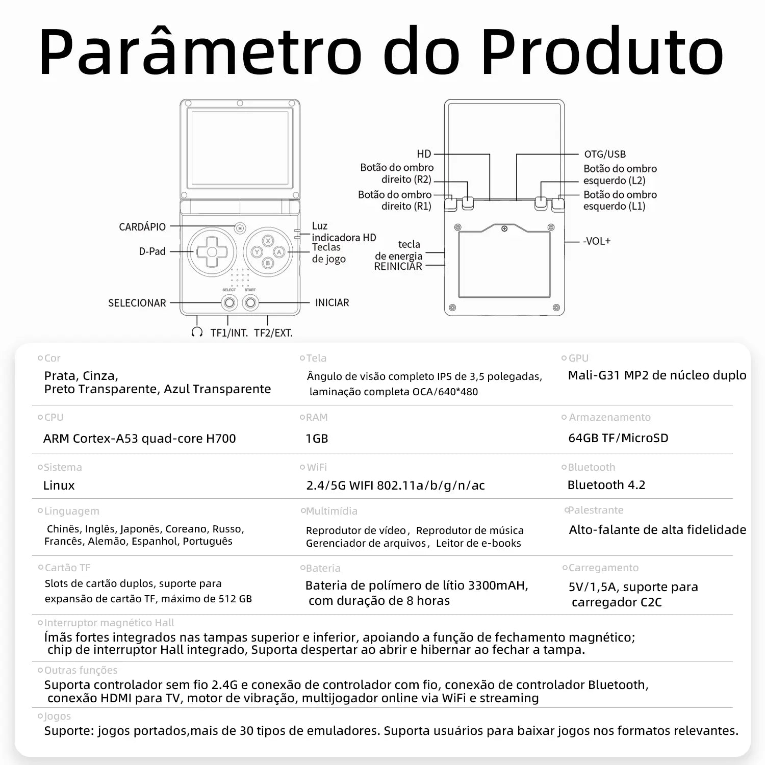 | Outras funções | Suporta controlador sem fio 2.4G e conexão de controlador com fio, conexão de controlador Bluetooth, conexão HD para TV, motor de vibração, multijogador online via WiFi e streaming |