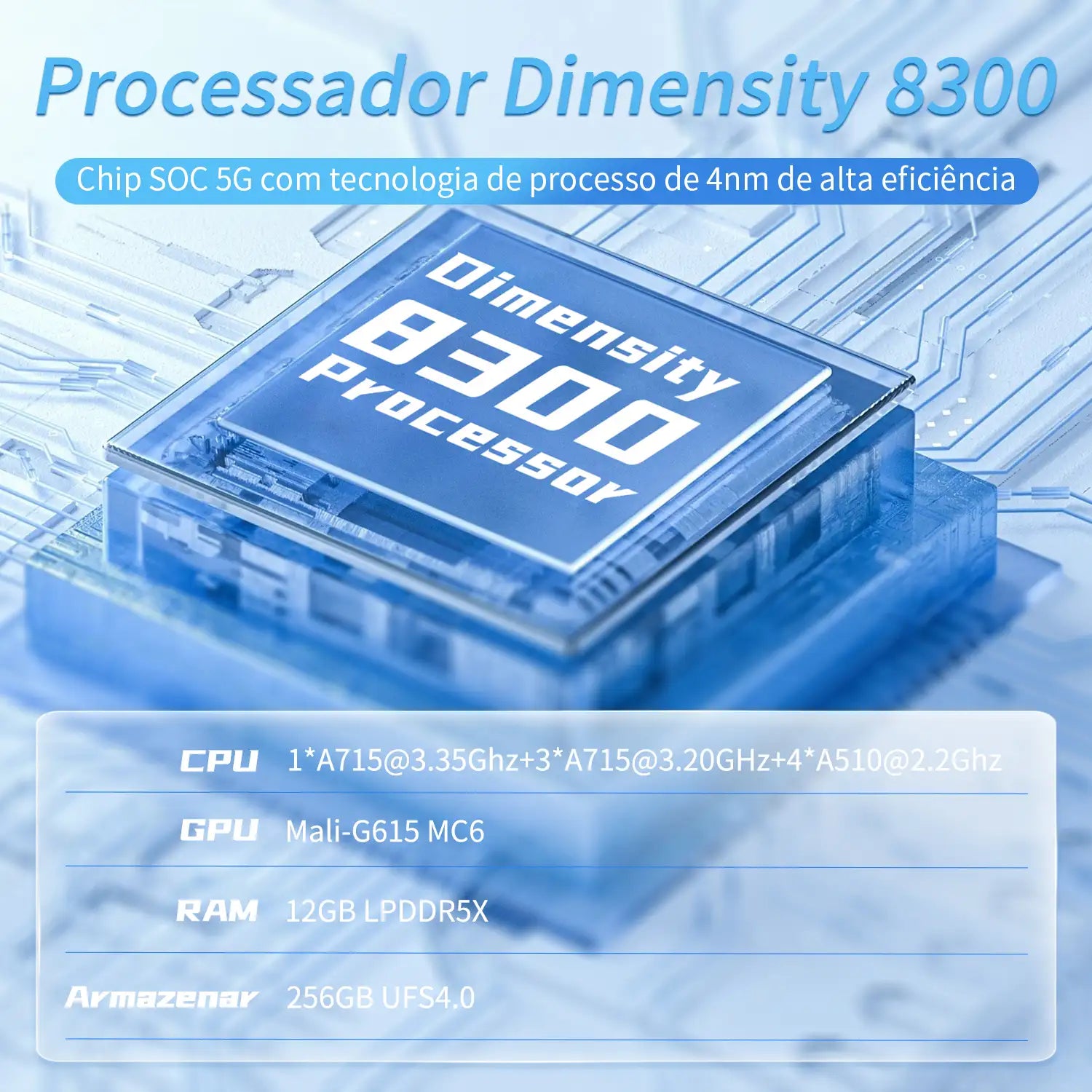 | CPU | Processador Dimensity 8300, tecnologia de processo 4nm de alta eficiência, chip 5G SOC, CPU octa-core incluindo 1*A715 @ 3,35 GHz + 3*A715 @ 3,20 GHz + 4*A510 @ 2,2 GHz. |