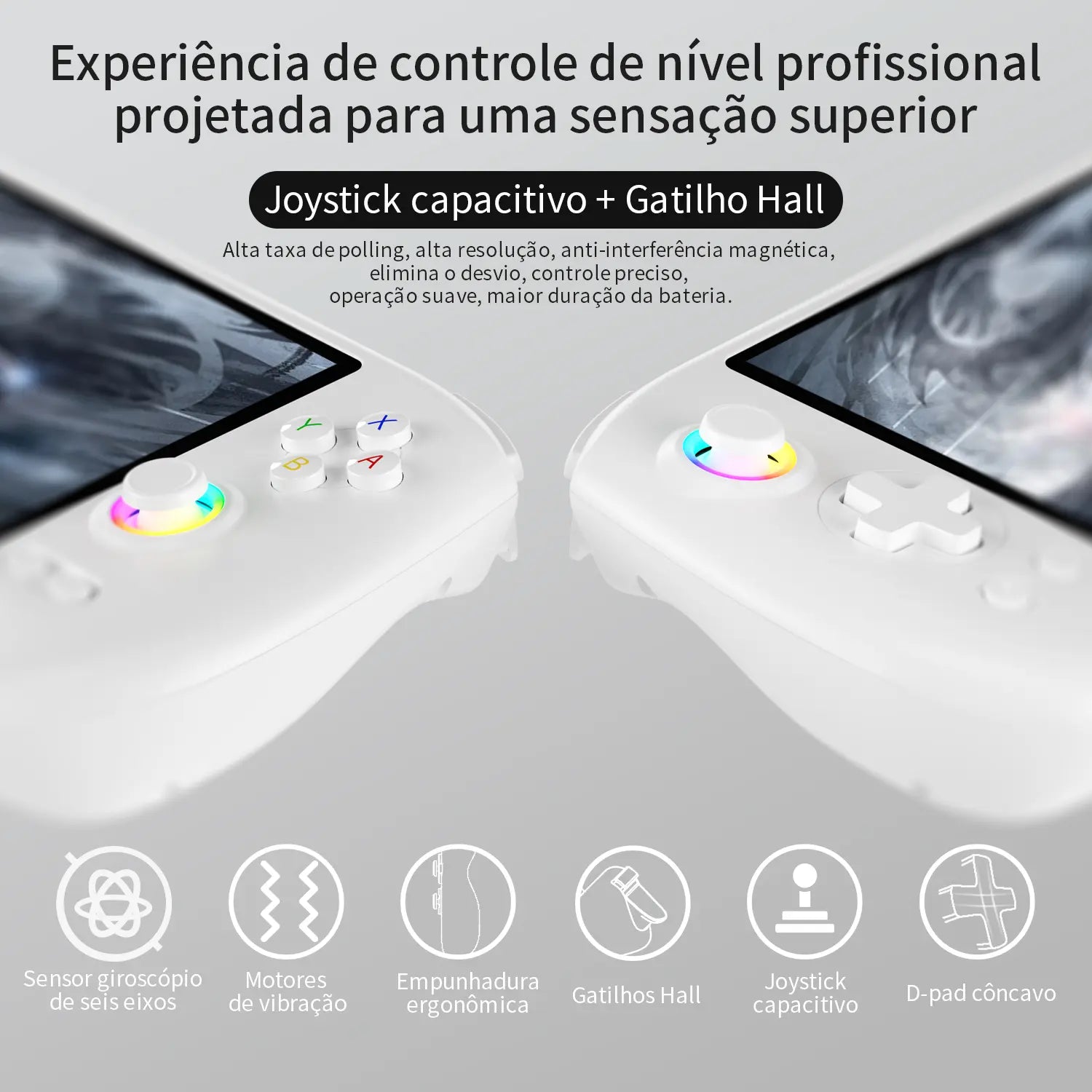 | Joysticks | Joystick capacitivo de alta resolução e anti-interferência magnética |