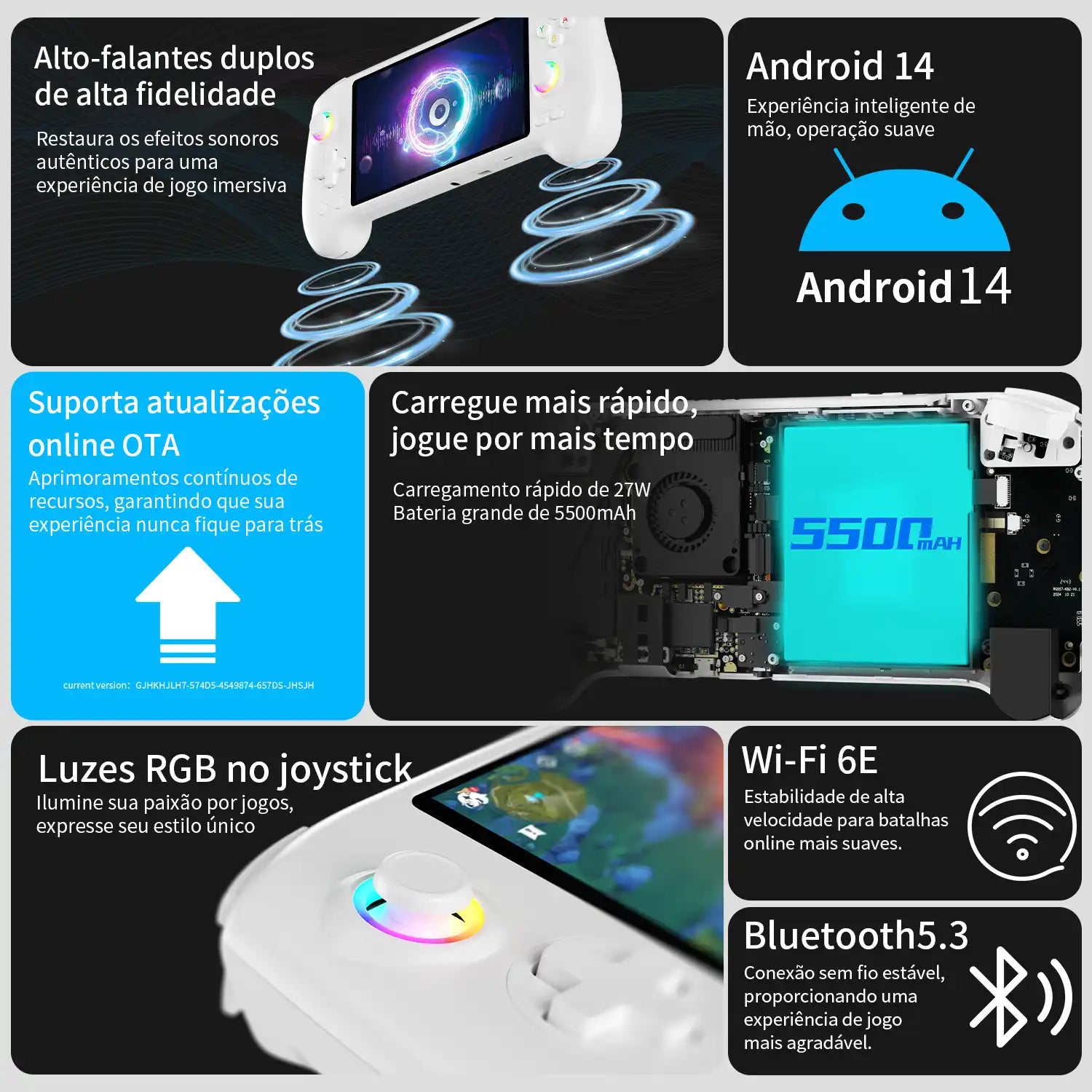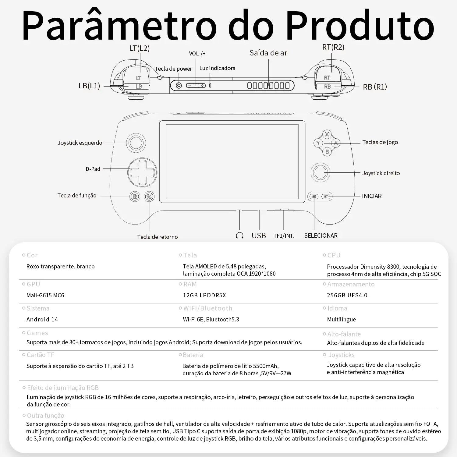 | Outra função | Sensor giroscópio de seis eixos integrado, gatilhos de hall, ventilador de alta velocidade + resfriamento ativo de tubo de calor. Suporta atualizações sem fio FOTA, multijogador online, streaming, projeção de tela sem fio, USB Tipo C suporta saída de porta de exibição 1080p, motor de vibração, suporta fones de ouvido estéreo de 3,5 mm, configurações de economia de energia, controle de luz de joystick RGB, brilho da tela, vários atributos funcionais e configurações personalizáveis. |